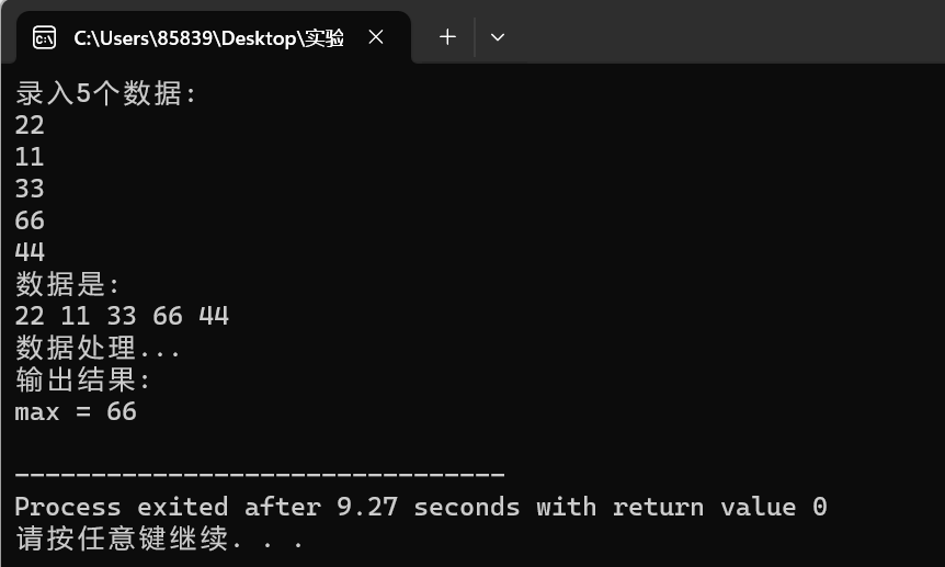 1 #include <stdio.h> 2 #define N 5 3 4 void input(int x[], int n); 5 void output(int x[], int n); 6 int *find_max(int x[], int n); 7 8 int main() { 9 int a[N]; 10 int *pmax; 11 12 printf("录入%d个数据:\n", N); 13 input(a, N); 14 15 printf("数据是: \n"); 16 output(a, N); 17 18 printf("数据处理...\n"); 19 pmax = find_max(a, N); 20 21 printf("输出结果:\n"); 22 printf("max = %d\n", *pmax); 23 24 return 0; 25 } 26 27 void input(int x[], int n) { 28 int i; 29 30 for(i = 0; i < n; ++i) 31 scanf("%d", &x[i]); 32 } 33 34 void output(int x[], int n) { 35 int i; 36 37 for(i = 0; i < n; ++i) 38 printf("%d ", x[i]); 39 printf("\n"); 40 } 41 42 int *find_max(int x[], int n) { 43 int max_index = 0; 44 int i; 45 46 for(i = 1; i < n; ++i) 47 if(x[i] > x[max_index]) 48 max_index = i; 49 50 return &x[max_index]; 51 }