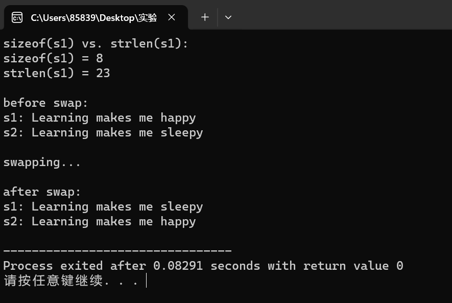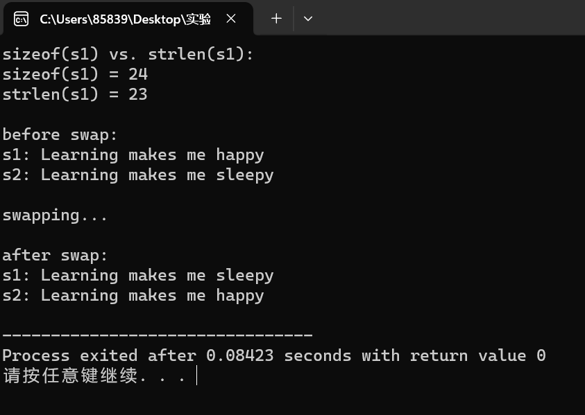1 #include <stdio.h> 2 #include <string.h> 3 #define N 80 4 5 int main() { 6 char s1[] = "Learning makes me happy"; 7 char s2[] = "Learning makes me sleepy"; 8 char tmp[N]; 9 10 printf("sizeof(s1) vs. strlen(s1): \n"); 11 printf("sizeof(s1) = %d\n", sizeof(s1)); 12 printf("strlen(s1) = %d\n", strlen(s1)); 13 14 printf("\nbefore swap: \n"); 15 printf("s1: %s\n", s1); 16 printf("s2: %s\n", s2); 17 18 printf("\nswapping...\n"); 19 strcpy(tmp, s1); 20 strcpy(s1, s2); 21 strcpy(s2, tmp); 22 23 printf("\nafter swap: \n"); 24 printf("s1: %s\n", s1); 25 printf("s2: %s\n", s2); 26 27 return 0; 28 }