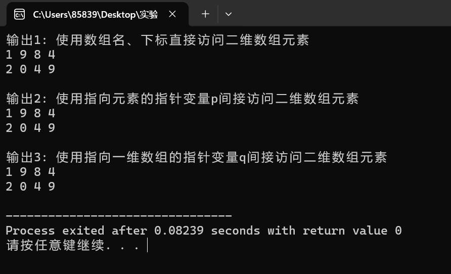 1 #include <stdio.h> 2 3 #include <stdio.h> 4 5 int main() { 6 int x[2][4] = {{1, 9, 8, 4}, {2, 0, 4, 9}}; 7 int i, j; 8 int *ptr1; // 指针变量,存放int类型数据的地址 9 int(*ptr2)[4]; // 指针变量,指向包含4个int元素的一维数组 10 11 printf("输出1: 使用数组名、下标直接访问二维数组元素\n"); 12 for (i = 0; i < 2; ++i) { 13 for (j = 0; j < 4; ++j) 14 printf("%d ", x[i][j]); 15 printf("\n"); 16 } 17 18 printf("\n输出2: 使用指向元素的指针变量p间接访问二维数组元素\n"); 19 for (ptr1 = &x[0][0], i = 0; ptr1 < &x[0][0] + 8; ++ptr1, ++i) { 20 printf("%d ", *ptr1); 21 22 if ((i + 1) % 4 == 0) 23 printf("\n"); 24 } 25 26 printf("\n输出3: 使用指向一维数组的指针变量q间接访问二维数组元素\n"); 27 for (ptr2 = x; ptr2 < x + 2; ++ptr2) { 28 for (j = 0; j < 4; ++j) 29 printf("%d ", *(*ptr2 + j)); 30 printf("\n"); 31 } 32 33 return 0; 34 }