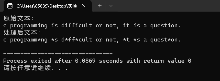 1 #include <stdio.h> 2 #define N 80 3 4 void replace(char *str, char old_char, char new_char); // 函数声明 5 6 int main() { 7 char text[N] = "c programming is difficult or not, it is a question."; 8 9 printf("原始文本: \n"); 10 printf("%s\n", text); 11 12 replace(text, 'i', '*'); // 函数调用 注意字符形参写法,单引号不能少 13 14 printf("处理后文本: \n"); 15 printf("%s\n", text); 16 17 return 0; 18 } 19 20 // 函数定义 21 void replace(char *str, char old_char, char new_char) { 22 int i; 23 24 while(*str) { 25 if(*str == old_char) 26 *str = new_char; 27 str++; 28 } 29 }