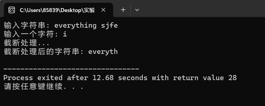 1 #include <stdio.h> 2 #define N 80 3 4 void str_trunc(char *str, char x); 5 6 int main() { 7 char str[N]; 8 char ch; 9 10 printf("输入字符串: "); 11 gets(str); 12 13 printf("输入一个字符: "); 14 ch = getchar(); 15 16 printf("截断处理...\n"); 17 str_trunc(str, ch); 18 19 printf("截断处理后的字符串: %s\n", str); 20 21 } 22 23 void str_trunc(char *str, char x) { 24 while(*str) { 25 if(*str == x) 26 *str='\0'; 27 ++str; 28 } 29 30 printf("%s",str); 31 }