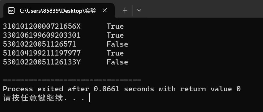 1 #include <stdio.h> 2 #include <string.h> 3 #define N 5 4 5 int check_id(char *str); // 函数声明 6 7 int main() { 8 char *pid[N] = {"31010120000721656X", 9 "330106199609203301", 10 "53010220051126571", 11 "510104199211197977", 12 "53010220051126133Y"}; 13 int i; 14 15 for (i = 0; i < N; ++i) 16 if (check_id(pid[i])) // 函数调用 17 printf("%s\tTrue\n", pid[i]); 18 else 19 printf("%s\tFalse\n", pid[i]); 20 21 return 0; 22 } 23 24 // 函数定义 25 // 功能: 检查指针str指向的身份证号码串形式上是否合法。 26 // 形式合法,返回1,否则,返回0 27 int check_id(char *str) { 28 int i; 29 if(strlen(str)!=18){ 30 return 0; 31 } 32 for(i=0;i<17;++i){ 33 if(str[i]<'0'||str[i]>'9'){ 34 return 0; 35 } 36 } 37 if(str[17]<'0'||(str[17]>'9'&&str[17]<'X')||str[17]>'X'){ 38 return 0; 39 } 40 }