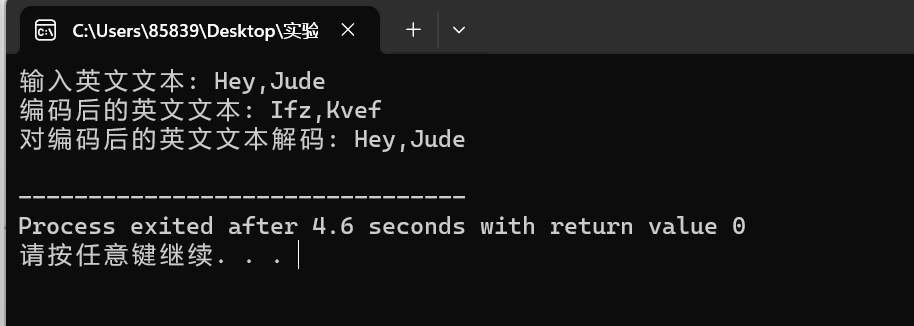 1 #include <stdio.h> 2 #define N 80 3 void encoder(char *str); // 函数声明 4 void decoder(char *str); // 函数声明 5 6 int main() { 7 char words[N]; 8 9 printf("输入英文文本: "); 10 gets(words); 11 12 printf("编码后的英文文本: "); 13 encoder(words); // 函数调用 14 printf("%s\n", words); 15 16 printf("对编码后的英文文本解码: "); 17 decoder(words); // 函数调用 18 printf("%s\n", words); 19 20 return 0; 21 } 22 23 /*函数定义 24 功能:对s指向的字符串进行编码处理 25 编码规则: 26 对于a~z或A~Z之间的字母字符,用其后的字符替换; 其中,z用a替换,Z用A替换 27 其它非字母字符,保持不变 28 */ 29 void encoder(char *str) { 30 int i=0; 31 while(str[i]!='\0'){ 32 if(str[i]>='a'&&str[i]<'z'||str[i]>='A'&&str[i]<'Z'){ 33 str[i]++; 34 } 35 else if(str[i]=='z'||str[i]=='Z'){ 36 str[i]-=25; 37 } 38 ++i; 39 } 40 } 41 42 /*函数定义 43 功能:对s指向的字符串进行解码处理 44 解码规则: 45 对于a~z或A~Z之间的字母字符,用其前面的字符替换; 其中,a用z替换,A用Z替换 46 其它非字母字符,保持不变 47 */ 48 void decoder(char *str) { 49 int i=0; 50 while(str[i]!='\0'){ 51 if(str[i]>'a'&&str[i]<='z'||str[i]>'A'&&str[i]<='Z'){ 52 str[i]--; 53 } 54 else if(str[i]=='a'||str[i]=='z'){ 55 str[i]+=25; 56 } 57 ++i; 58 } 59 }