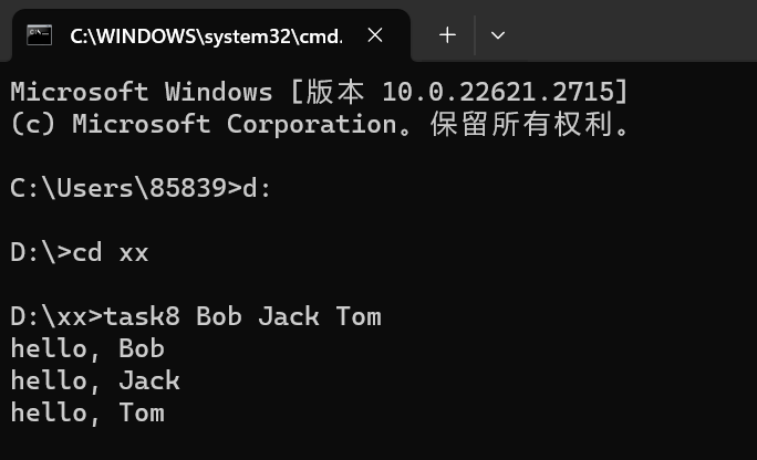 1 #include <stdio.h> 2 3 int main(int argc, char *argv[]) { 4 int i; 5 6 for(i = 1; i < argc; ++i) 7 printf("hello, %s\n", argv[i]); 8 9 return 0; 10 }