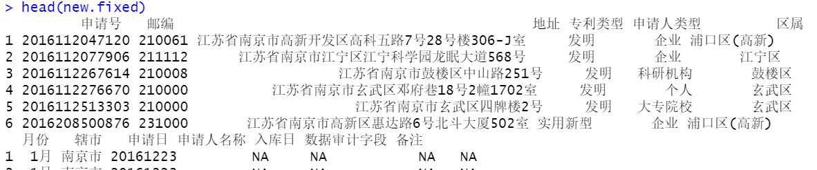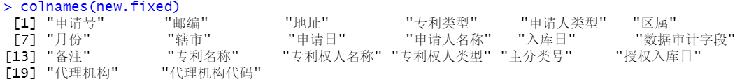 #比较各列 > sum(is.na(new.fixed$主分类号.y)) [1] 0 > sum(is.na("地址.x")) [1] 0 > sum(is.na("专利类型.x" )) [1] 0 > sum(is.na( "区属.x" )) [1] 0 > sum(is.na("月份.x")) [1] 0 > sum(is.na("辖市.x")) [1] 0 > sum(is.na("申请日.x" )) [1] 0 > sum(is.na("邮编.x")) [1] 0 #更该名称,删除列 names(new.fixed)[names(new.fixed) == "主分类号.y"] = "主分类号" names(new.fixed)[names(new.fixed) == "地址.x"] = "地址" names(new.fixed)[names(new.fixed) == "申请日.x"] = "申请日" names(new.fixed)[names(new.fixed) == "辖市.x"] = "辖市" names(new.fixed)[names(new.fixed) == "月份.x" ] = "月份" names(new.fixed)[names(new.fixed) == "区属.x" ] = "区属" names(new.fixed)[names(new.fixed) == "专利类型.x"] = "专利类型" new.fixed <- new.fixed[ , -which(colnames(new.fixed) %in% c("申请日.y" ,"辖市.y","主分类号.x", "月份.y", "区属.y" ,"专利类型.y" ))] -