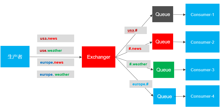 channel.BasicPublish(exchange: "TopicExchange", routingKey: "China.weather",