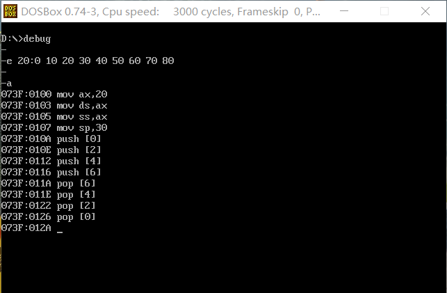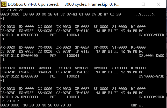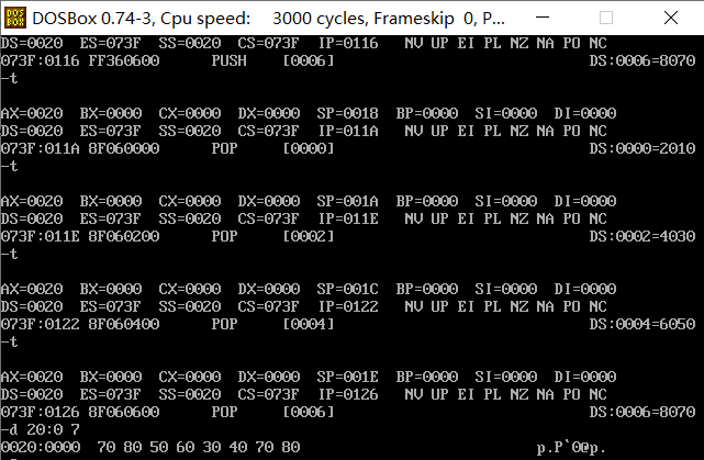 pop [6] 指令执行结束后,使用d命令 d 20:0 7查看此时数据空间内的数据,发现数据有变化,实验截图如下: