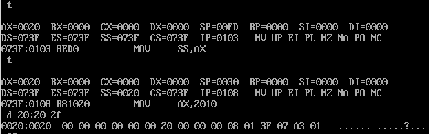 问题1:单步执行完mov ss,ax之后指令并没有暂停,后面那条指令也是随即立即执行了。debug的单步调试是一种中断,但由于CPU在执行期间不响应中断请求,所以debug显示的是CPU执行完栈段和栈顶指针分配后的情况。