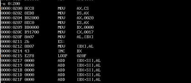 继续在debug中调试,使用g命令将程序执行到 loop s 之后、 mov ax, 4c00h 之前,然后,使用u命令对0:200h开始的内存单元反汇编,确认是否把task7.asm中line3-line12的代码复制到了目标内存空间。如下图: