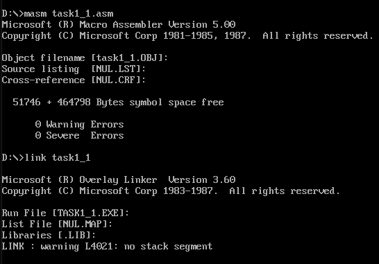 assume ds:data, cs:code, ss:stack data segment db 16 dup(0) data ends stack segment db 16 dup(0) stack ends code segment start: mov ax, data mov ds, ax mov ax, stack mov ss, ax mov sp, 16 mov ah, 4ch int 21h code ends end start-