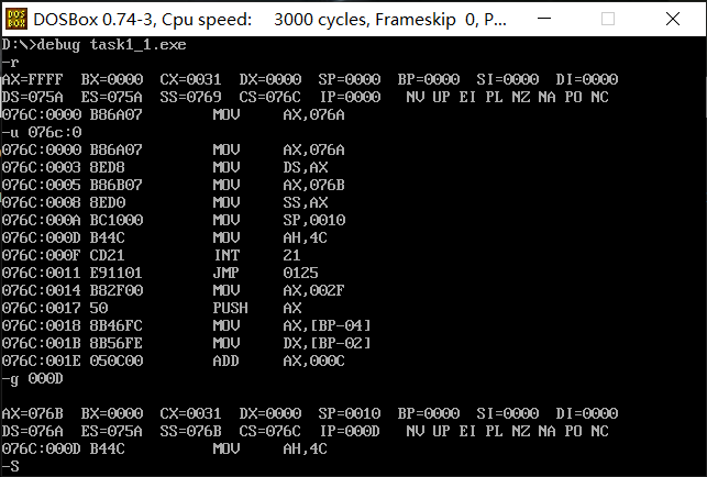 assume ds:data, cs:code, ss:stack data segment db 20 dup(0) data ends stack segment db 20 dup(0) stack ends code segment start: mov ax, data mov ds, ax mov ax, stack mov ss, ax mov sp, 20 mov ah, 4ch int 21h code ends end start-