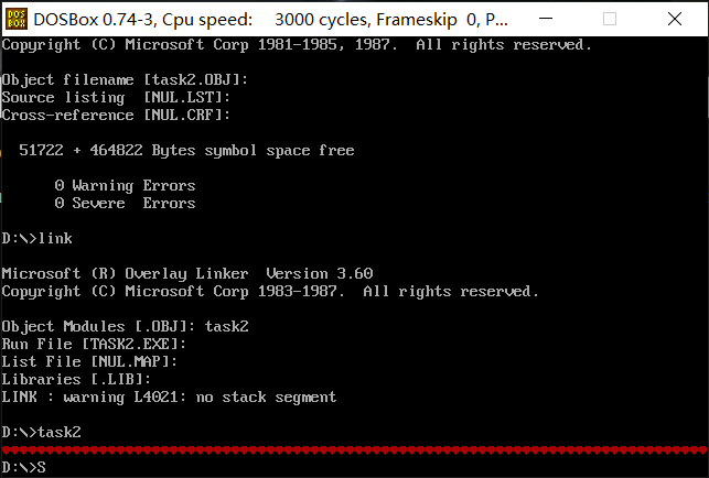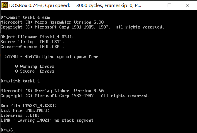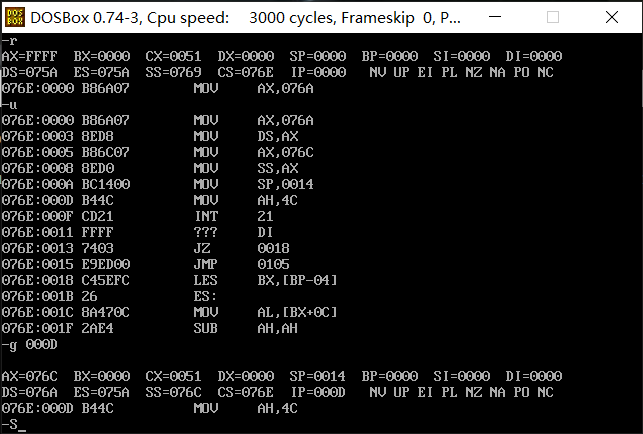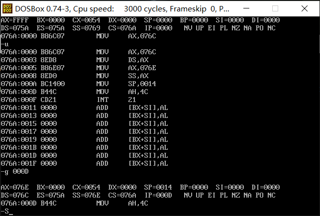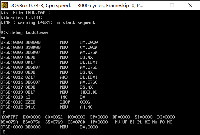 assume ds:data, cs:code, ss:stack code segment start: mov ax, data mov ds, ax mov ax, stack mov ss, ax mov sp, 20 mov ah, 4ch int 21h code ends data segment db 20 dup(0) data ends stack segment db 20 dup(0) stack ends end start-