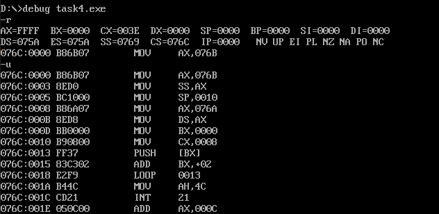 assume ds:data, cs:code, ss:stack data segment db 4 dup(0) data ends stack segment db 8 dup(0) stack ends code segment start: mov ax, data mov ds, ax mov ax, stack mov ss, ax mov sp, 8 mov ah, 4ch int 21h code ends end start-