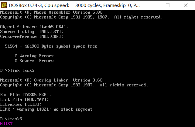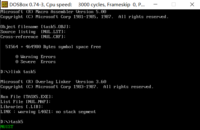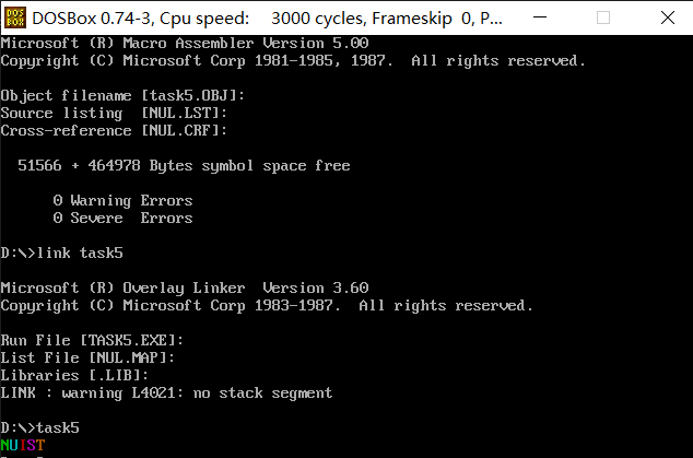 db 2,3,4,5,6 --> 改成: db 5 dup(2) 或 db 5 dup(5)此处改成 db 5 dup(2)则为绿色“ NUIST ”,改为 db 5 dup(5)则为品红色“ NUIST ”结果截图如下: