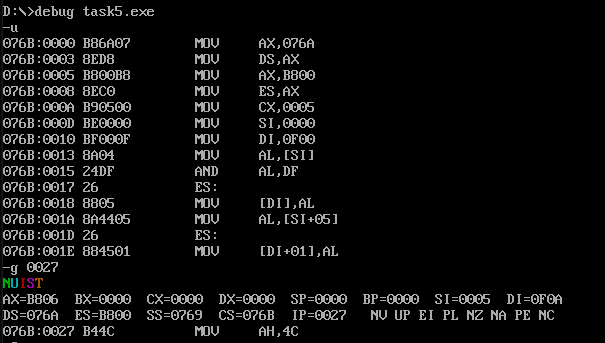 assume cs:code, ds:data data segment db 'Nuist' db 5 dup(2) data ends code segment start: mov ax, data mov ds, ax mov ax, 0b800H mov es, ax mov cx, 5 mov si, 0 mov di, 0f00h s: mov al, [si] and al, 0dfh mov es:[di], al mov al, [5+si] mov es:[di+1], al inc si add di, 2 loop s mov ah, 4ch int 21h code ends end start -