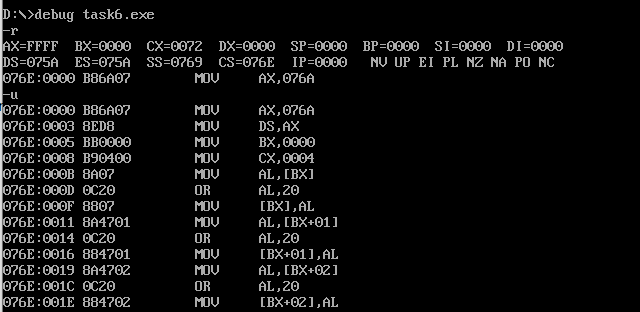 assume cs:code, ds:data data segment db 'Pink Floyd ' db 'JOAN Baez ' db 'NEIL Young ' db 'Joan Lennon ' data ends code segment start: mov ax,data mov ds,ax mov bx,0 mov cx,4 s: mov al,[bx] or al,20h mov [bx],al mov al,[bx + 1] or al,20h mov [bx + 1],al mov al,[bx + 2] or al,20h mov [bx +2],al mov al,[bx + 3] or al,20h mov [bx+3],al add bx,16 loop s mov ah, 4ch int 21h code ends end start -