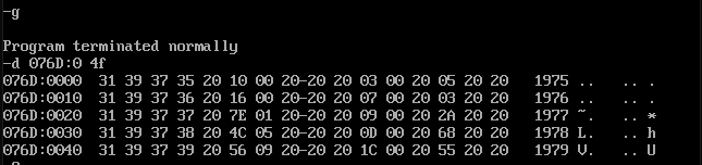 在debug中运行到程序退出之前,使用d命令查看table段对应的内存空间的截图,确认信息已经按要求结构化地写入到指定内存,截图如下: