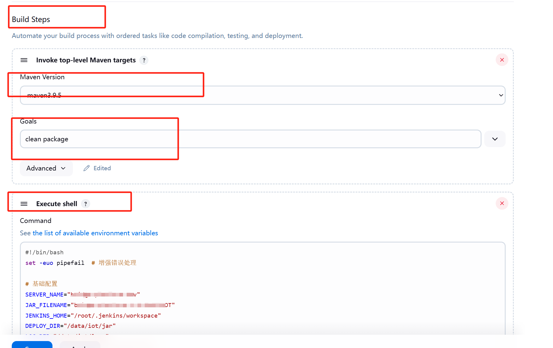 下面是构建步骤,选择maven版本,maven打包命令。新增一个shell脚本,用来打jar包,然后根据项目中的dockerfile文件打镜像,再推到harbor仓库。