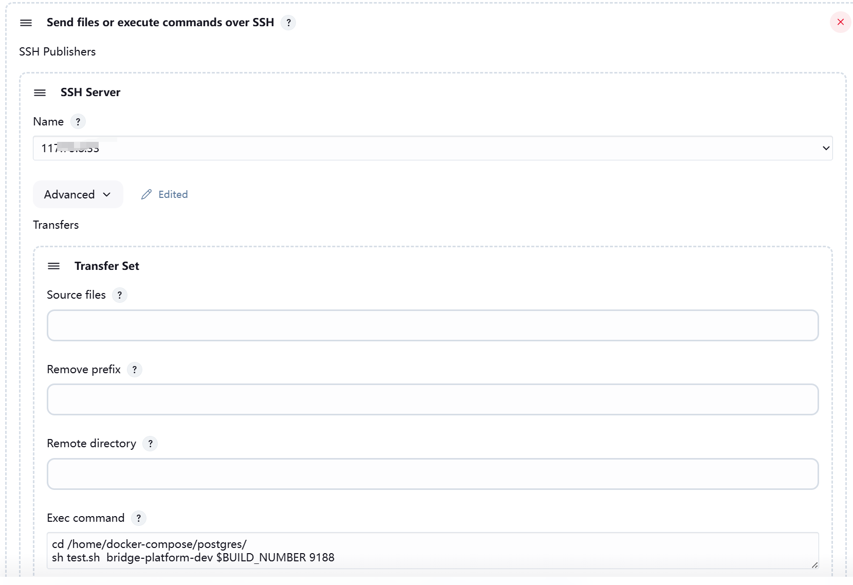 新增一个SSH Publishers,name选择ssh server,这个需要提前去jenkins的设置里配一下。Exec command里是执行该ssh文件上的test.sh脚本,并且传参三个。分别是项目名、构建版本号、项目端口。