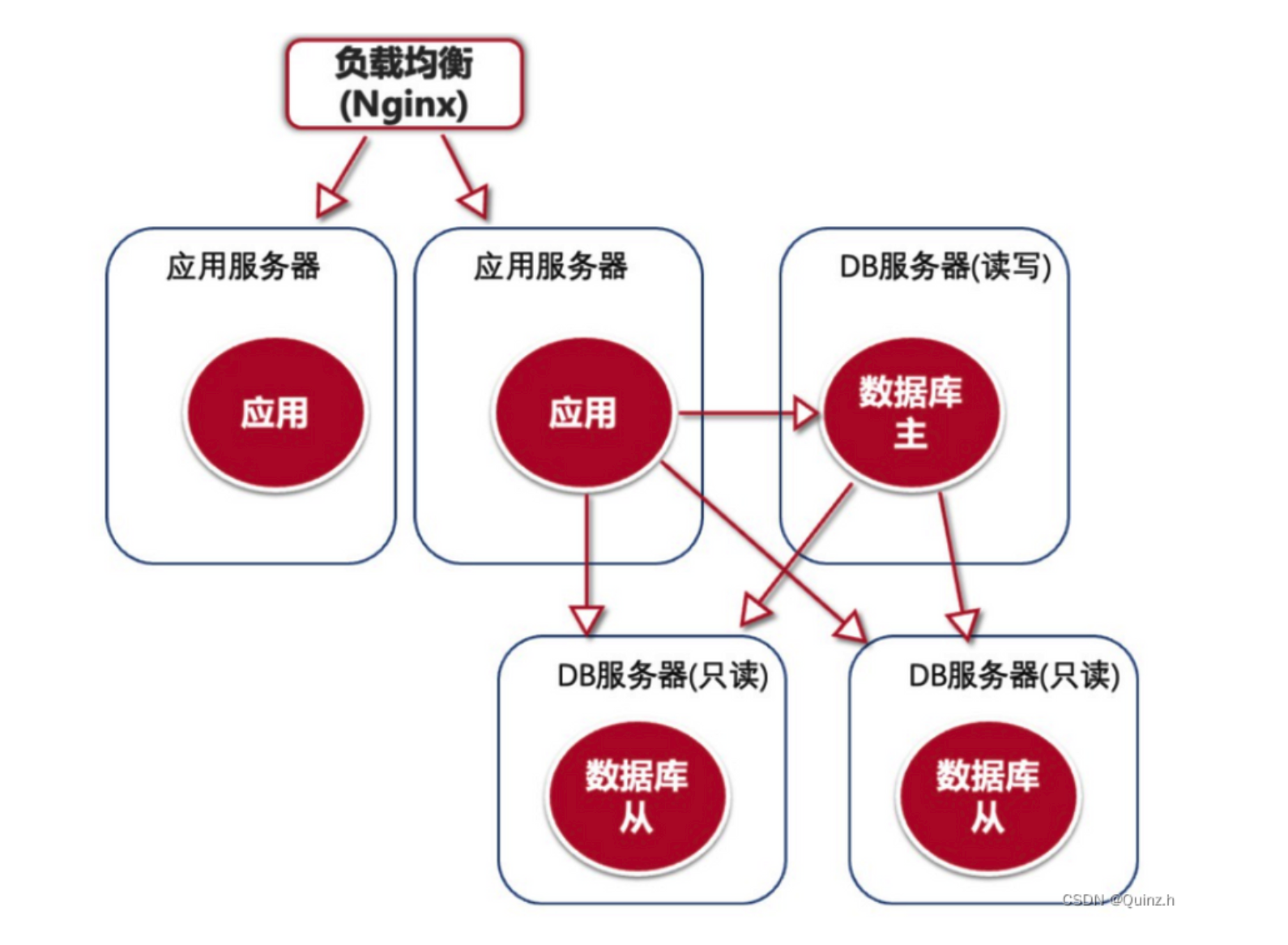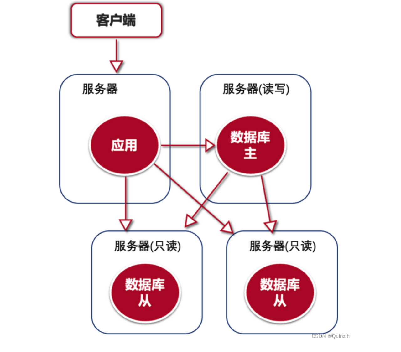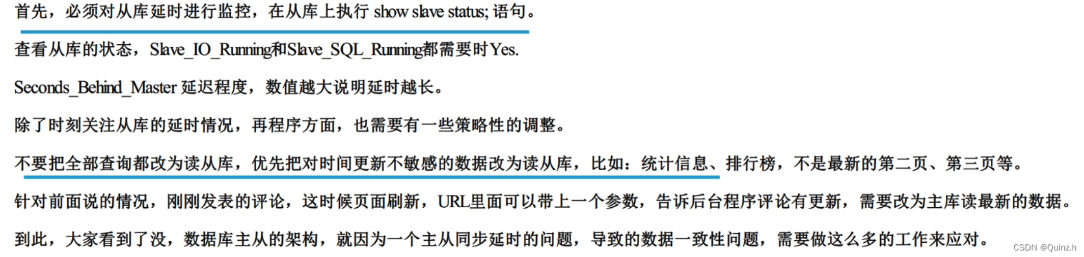 3.数据库主从架构:数据库拥堵和慢查询的情况下,mysql主从模式,增加数据库服务器,一主多从,主库写从库读。程序修改:1是需要增加mysql的从库,2是需要把数据库实例改为读和写实例,3是数据查询的地方要改用读实例。 重点:处理好主从读写分离的同步延时,数据一致性问题。解决方法: