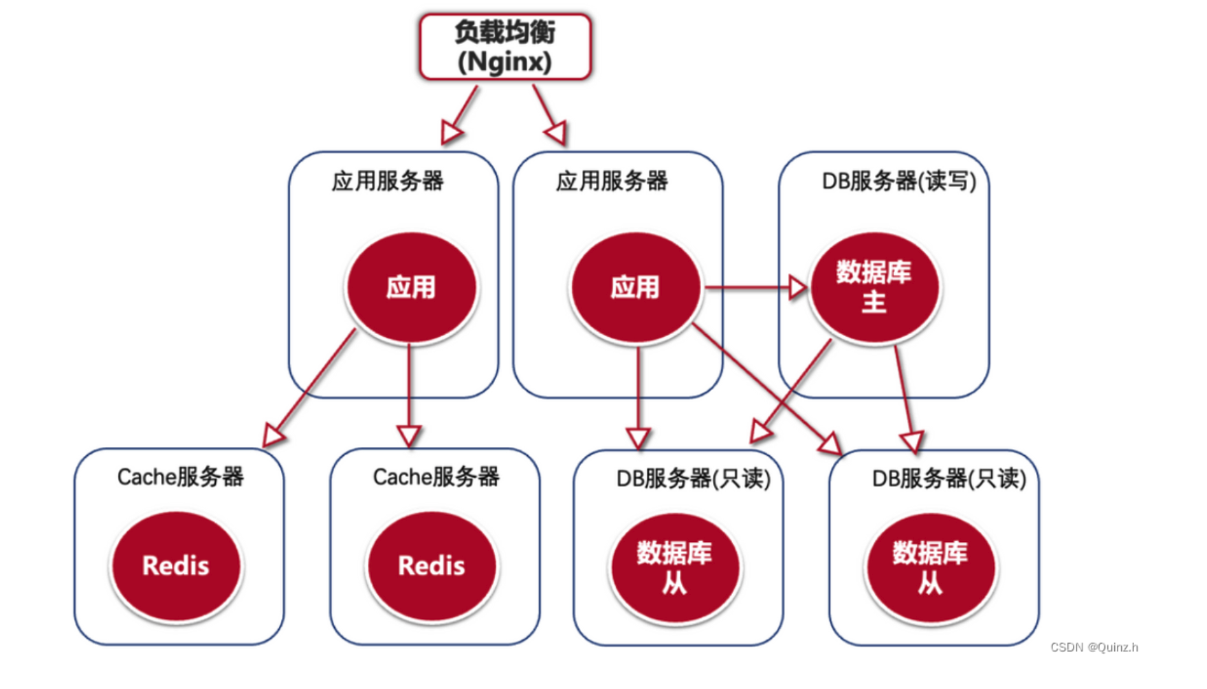5.分布式缓存架构:在分布式应用架构的基础上,在数据库慢查询越来越多的情况下使用。重点:引入缓存,解放数据库。(下图以redis为例)例如:使用redis集群,reids服务单机可以支持10w的并发,而mysql可以支持1000,可见redis缓存比mysql数据要快100倍。可以把一些耗时几百毫秒的慢查询的结果缓存起来,缓存查询耗时只有1-2ms,性能提升了上百倍。