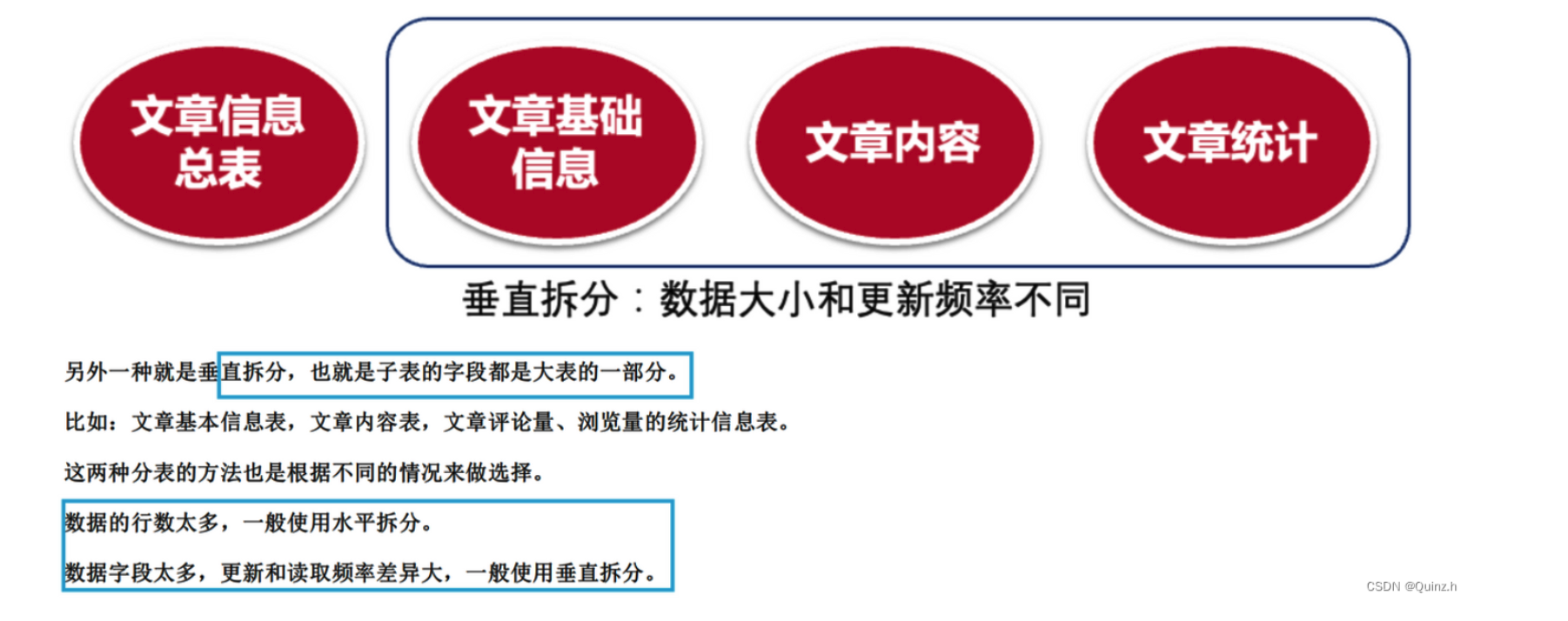 对于数据规模越来越大的情况,重点是进行水平拆分和垂直拆分。问题:文章表和评论表的数据总量都超过千万规模时,虽然加入了分布式缓存,但是,只要涉及到数据库的查询、批量更新等操作时,又会变得很慢,再次成为整个系统的瓶颈。解决思路;单表的数据量太大,可以考虑对数据表进行分表,让单张表的数据规模控制在百万的规模。分为两种:水平拆分和垂直拆分。