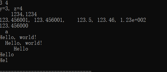 #include <stdio.h> int main() { int x=1234; float f=123.456; double m=123.456; char ch='a'; char a[]="Hello, world!"; int y=3, z=4; printf("%d %d\n", y, z); printf("y=%d, z=%d\n", y,z); printf("%8d,%2d\n", x,x); printf("%f, %8f, %8.1f, %0.2f, %.2e\n",f,f,f,f,f); printf("%lf\n",m); printf("%3c\n", ch); printf("%s\n%15s\n%10.5s\n%2.5s\n%.3s\n",a,a,a,a,a); return 0; }