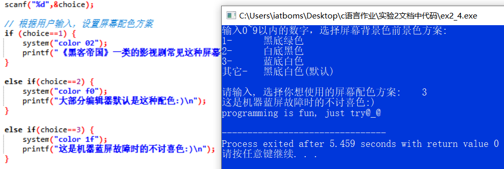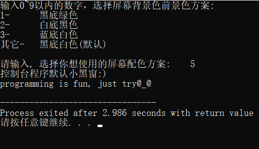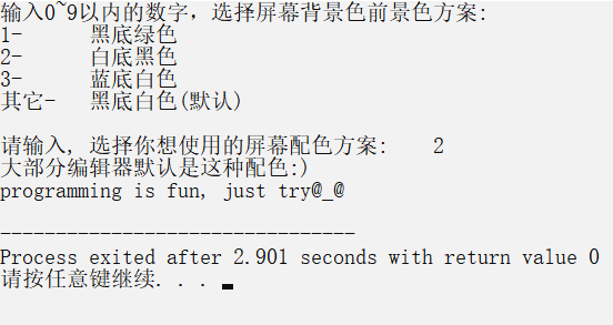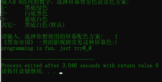 #include <stdio.h> #include <stdlib.h> int main() { int choice; // 显示菜单 printf("输入0~9以内的数字,选择屏幕背景色前景色方案: \n"); printf("1-\t黑底绿色\n"); printf("2-\t白底黑色\n"); printf("3-\t蓝底白色\n"); printf("其它-\t黑底白色(默认)\n"); printf("\n请输入, 选择你想使用的屏幕配色方案: "); // 要求用户从键盘输入0~9的数字,选择屏幕配色方案 scanf("%d",&choice); // 根据用户输入,设置屏幕配色方案 if (choice==1) { system("color 02"); printf("《黑客帝国》一类的影视剧常见这种屏幕色:)\n"); } else if(choice==2) { system("color f0"); printf("大部分编辑器默认是这种配色:)\n"); } else if(choice==3) { system("color 1f"); printf("这是机器蓝屏故障时的不讨喜色:)\n"); } else { system("color 0f"); printf("控制台程序默认小黑窗:)\n"); } printf("programming is fun, just try@_@\n"); return 0; }