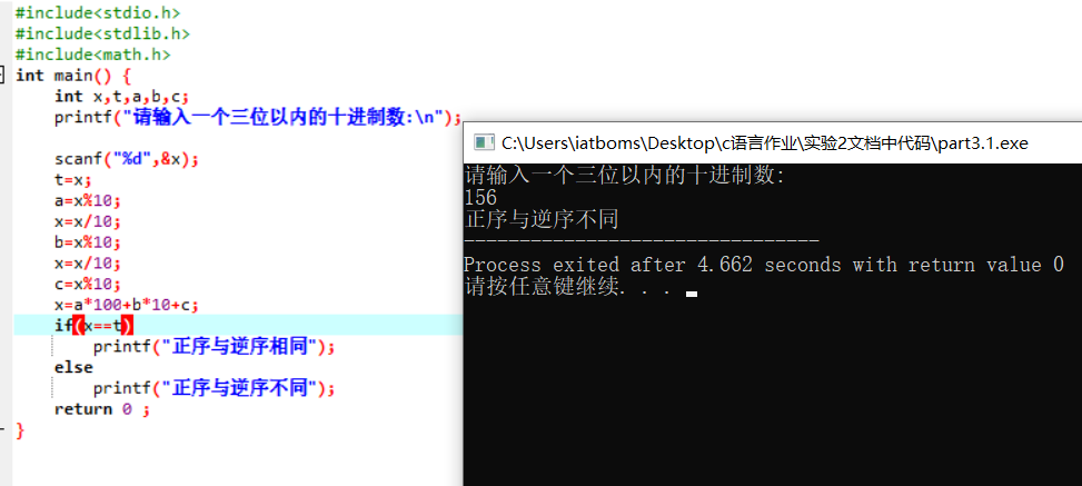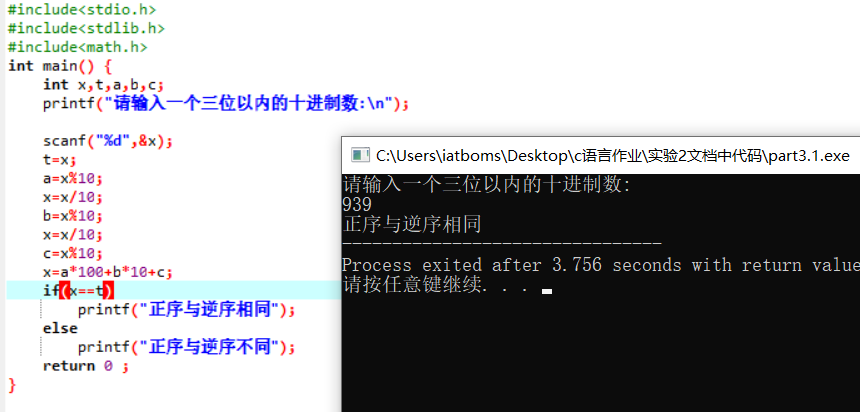 #include<stdio.h> #include<stdlib.h> #include<math.h> int main() { int x,t,a,b,c; printf("请输入一个三位以内的十进制数:\n"); scanf("%d",&x); t=x; a=x%10; x=x/10; b=x%10; x=x/10; c=x%10; x=a*100+b*10+c; if(x==t) printf("正序与逆序相同"); else printf("正序与逆序不同"); return 0 ; }