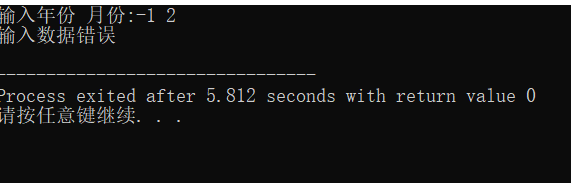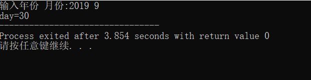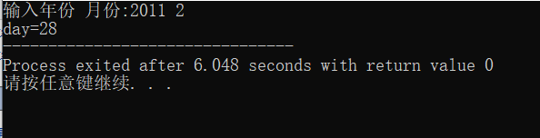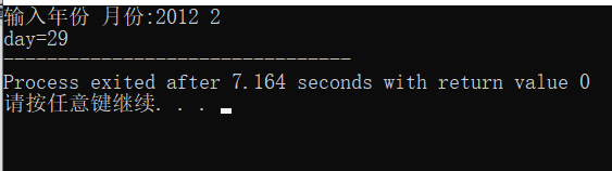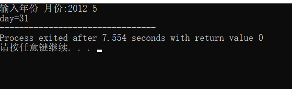#include<stdio.h> #include<stdlib.h> #include<math.h> int main() { int x,y,z; int a=28; printf("输入年份 月份:"); scanf("%d%d",&x,&y); if(x<0||y>12||y<1) { printf("输入数据错误\n"); exit(0); } if(x%4==0&&x%100!=0||x%400==0) { a=a+1; } if(y==1||y==3||y==5||y==7||y==8||y==10||y==12) printf("day=31"); else if(y==2) { printf("day=%d",a); } else { printf("day=30"); } return 0; }