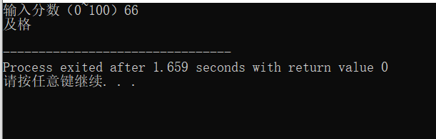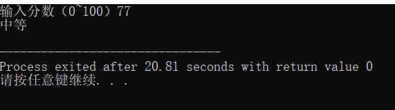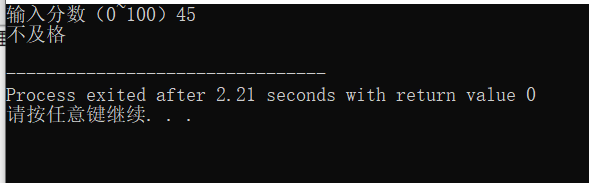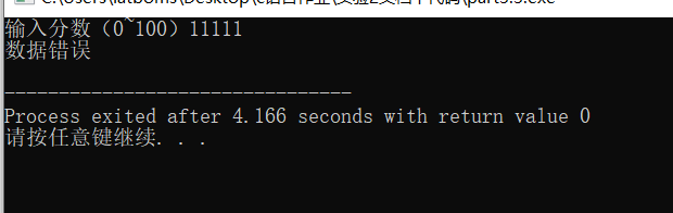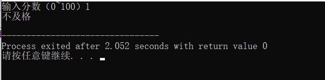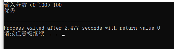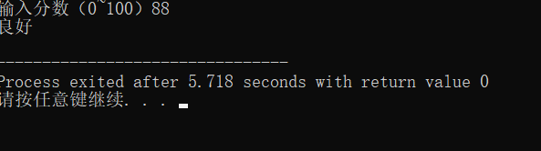 #include<stdio.h> #include<stdlib.h> #include<math.h> int main() { int x; printf("输入分数(0~100)"); scanf("%d",&x); switch(x/abs(x)){ case 1:switch(x/10) { case 10: case 9:printf("优秀\n");break; case 8:printf("良好\n");break; case 7:printf("中等\n");break; case 6:printf("及格\n");break; case 5:printf("不及格\n");break; case 4:printf("不及格\n");break; case 3:printf("不及格\n");break; case 2:printf("不及格\n");break; case 1:printf("不及格\n");break; case 0:printf("不及格\n");break; default:printf("数据错误\n");break; } case -1:printf("数据错误\n");break; } return 0; }