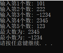 /* 编程找出5个整数的最大数和最小数 《C语言程序设计教程学习指导》p122实验内容(3) */ #include <stdio.h> #include <stdlib.h> int main() { int number, max, min, n; n=1; printf("输入第%d个数: ", n);//第一次输入 scanf("%d", &number); max = number; min = number; while(n<5) { n++; printf("输入第%d个数: ", n);//第二到五次输入 scanf("%d", &number); if(number>max) max = number; else if(number<min) min = number; } printf("最大数为: %d\n", max); printf("最小数为: %d\n", min); system("pause"); return 0; }