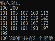 #include<math.h> #include<stdio.h> int main(){ int q,z,i,x,n,c; c=0; printf("输入起止\n"); scanf("%d%d",&q,&z); for(x=q;x>=q&&x<=z;x++){ for(i=2,n=0;i<x;i++){ if(x%i==0) n++; } if(n==0){ printf("%d ",x); c++; if(c%5==0) printf("\n"); } } printf("\n%d~%d间共有%d个素数",q,z,c); return 0; }