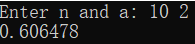 #include<stdio.h> #include<math.h> //s=1/a+2/aa+3/aa...+n/(a...a) float n,a,b,c,d,e,f,s,z; float xs(float a,float b); int main(){ printf("Enter n and a: "); scanf("%f%f",&n,&a); for(b=1;b<=n;b=b+1){ s=xs(a,b)+s; } printf("%f",s); return 0; } float xs(float a,float b){ for(c=1,d=0,f=1;f<=b;c=c*10,f=f+1){ d=d+a*c;} e=(b/d); return e; }