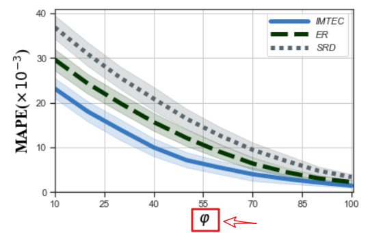 sns.set(style='ticks') sns.set_context(rc={'lines.linewidth':5}) plt.xlim((10,100.5)) plt.ylim((0,41)) plt.xticks(np.arange(10, 100.5, 15)) plt.yticks(np.arange(0,41,10)) # "greyish", "faded green", colors = ["windows blue", "dark green", "slate grey"] palette = sns.xkcd_palette(colors) ax = sns.lineplot(x="phi", y="MAPE",hue = 'alg', style='alg',data=df_mape_change_phi, markers = False,palette=palette) # - 实线-- 短线-.短点相间线:虚点线 # ax.lines[0].set_linestyle("-") # ax.lines[1].set_linestyle("-.") # ax.lines[2].set_linestyle("--") plt.xlabel(r'$\varphi$', fontdict={'color': 'black','family': 'Times New Roman','size': 18}) plt.ylabel(r'MAPE($\times 10^{-3}$)', fontdict={'color': 'black','family': 'Times New Roman','size': 18}) plt.legend(['IMTEC','ER','SRD'],prop={'style': 'italic'},handlelength=4)#图例 plt.grid(True) plt.tight_layout() plt.savefig('local_pic/phi_mape.jpg',dpi=600) # plt.savefig('loc_svg/TD_precision_tasknum.svg') plt.show()