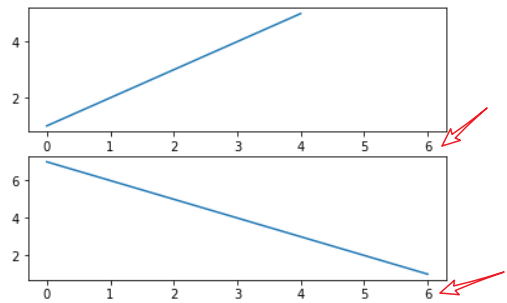 import matplotlib import matplotlib.pyplot as plt fig = plt.figure() ax1 = fig.add_subplot(211) ax1.plot([1,2,3,4,5]) ax2 = fig.add_subplot(212,sharex=ax1) ax2.plot([7,6,5,4,3,2,1]) fig.show()