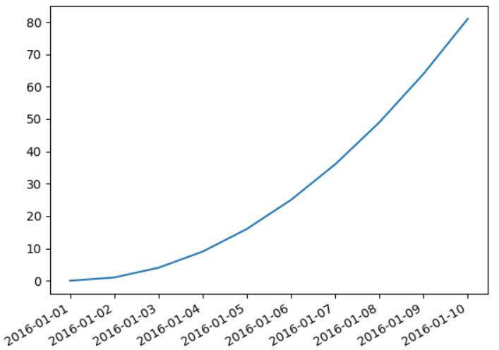 import datetime import matplotlib.pyplot as plt import matplotlib.dates as mdates d0 = datetime.date(2016,1,1) ndates = [d0+datetime.timedelta(i) for i in range(10)] n_ys = [i*i for i in range(10)] fig,ax = plt.subplots(1) ax.plot(ndates,n_ys)