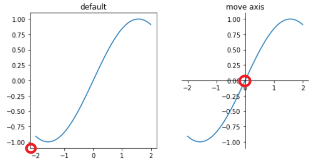 import matplotlib.pyplot as plt import numpy as np X = np.linspace(-2,2,num=100) Y = np.sin(X) fig = plt.figure(figsize=(8,4)) # ax1 ax1 = fig.add_subplot(1,2,1) ax1.plot(X,Y) ax1.set_title('default') # ax2 ax2 = fig.add_subplot(1,2,2) ax2.plot(X,Y) ax2.spines['right'].set_color('none') # 不显示右边框 ax2.spines['top'].set_color('none') # 不显示上边框 ax2.xaxis.set_ticks_position('bottom') # 设置x坐标轴为下边框 ax2.yaxis.set_ticks_position('left') # 设置y坐标轴为左边框 ax2.spines['bottom'].set_position(('data',0))# 设置x轴, y轴在(0, 0)的位置 ax2.spines['left'].set_position(('data',0)) ax2.set_title('move axis')