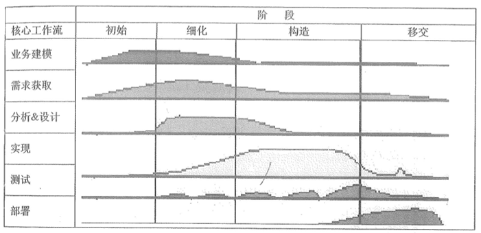 28、迭代模型的生命周期四个阶段:初始、细化、构造、移交,可进行步描述为周期(Cycle)、阶段(Phase)、迭代(Iteration)。核心工作流从技术角度描述迭代模型的静态组成部分,包括:业务建模、需求获取、分析与设计、实现、测试、部署。如下图所示: