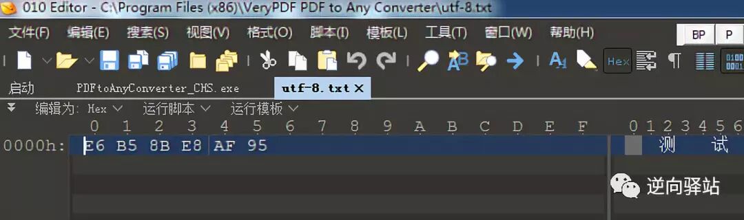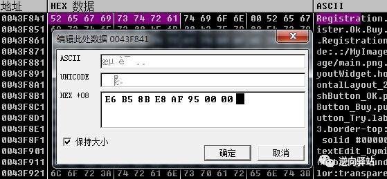修改后,生成新的qtcore4.dll文件,替换原版qtcore4.dll就会发现,再去汉化此软件,乱码问题已经解决了。我们依然以汉化题目为示例,OD中修改数据(如果你是大量汉化工作就别用OD了否则累死哦),注意要是utf-8的内存编码形式,关于编码常识可以在公众号内回复“编码”阅读,也可以点此链接 编码常识 ,修改标题registration为“测试”,“测试”的utf-8内存编码模式16进制数据是E6 B5 8B E8 AF 95 ,转换方法如下,有兴趣的也可以自己写工具