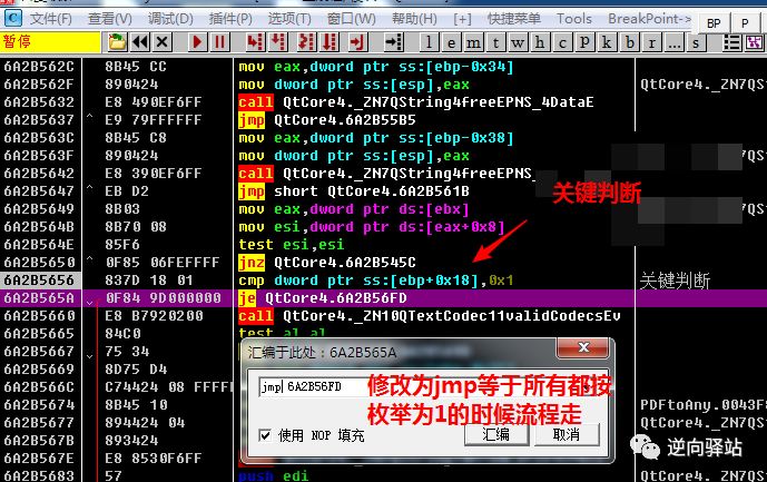 修改QCoreApplication::translate内部逻辑,让枚举类型为0时,也按为1的流程逻辑走(最常见的爆破套路),有点通用性很强,极大程度适用很多QT程序汉化乱码问题