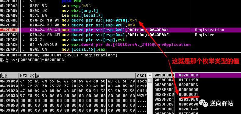 可见,两个函数其实最终调用的都是第一个函数,而核心关键点就是枚举类型参数的值,那么我们在第一个库函数入口【6A2B5818】下断点动态运行一下,堆栈中观察参数的变化,如下动图