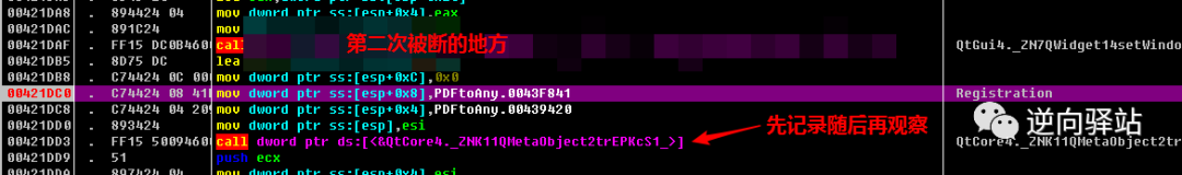 断点下好后,运行程序,观察调用字符串的逻辑流程,发现下的三个断点中有两个在程序启动会被调用,调用的目的分别是作为两个QT库函数的参数,如下图