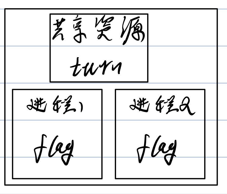 其中,turn是共享资源,两进程会进行抢夺。intertest[2]看似是共享资源,但intertst[0]只被进程1修改,intertst[1]只被进程2修改,可看作他们的私有资源。