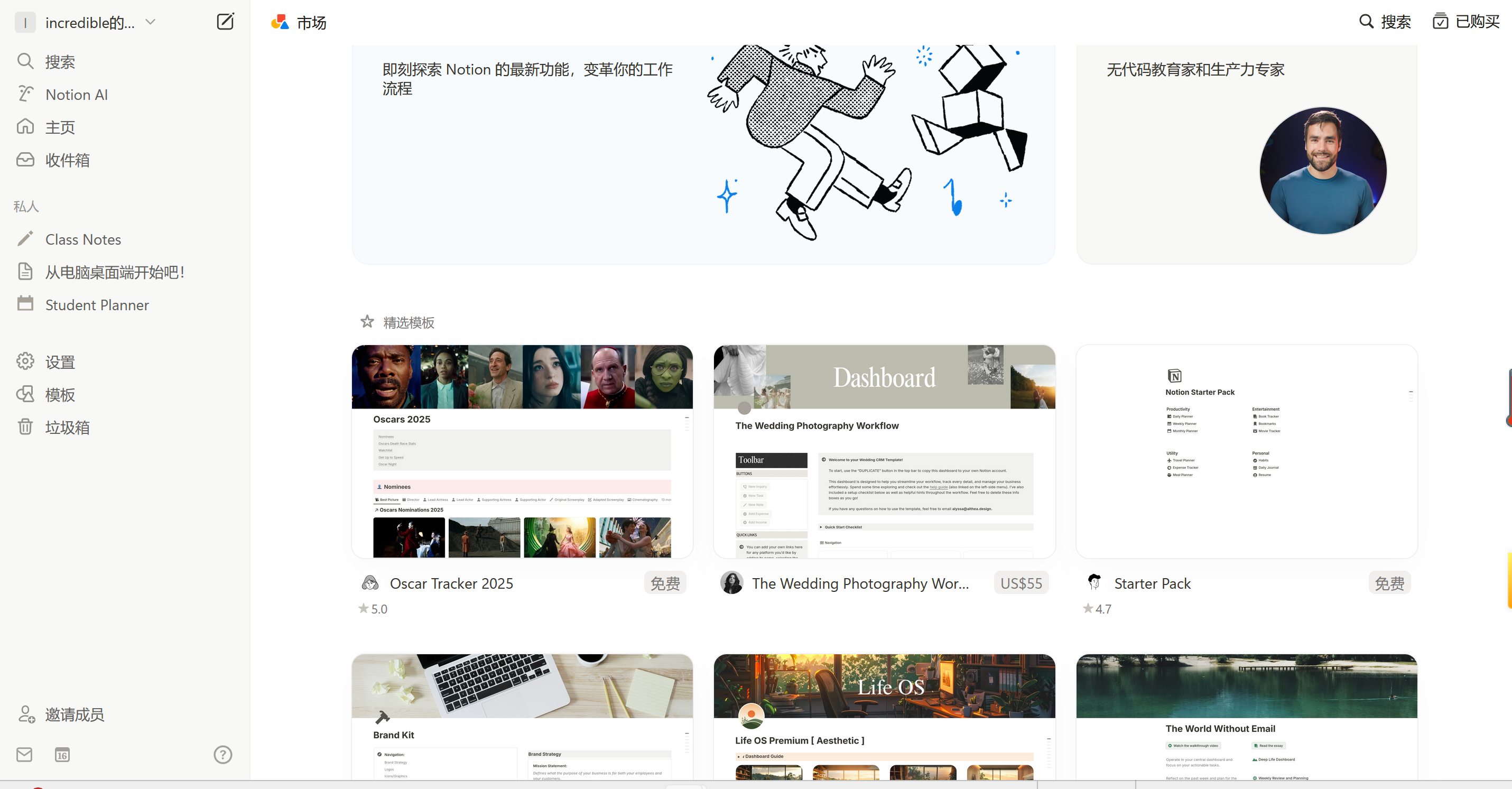 此外,可能会有用户觉得这个页面过于简单,Notion还提供了各种模板,有免费的也有付费的,有各种个性化的适配方案