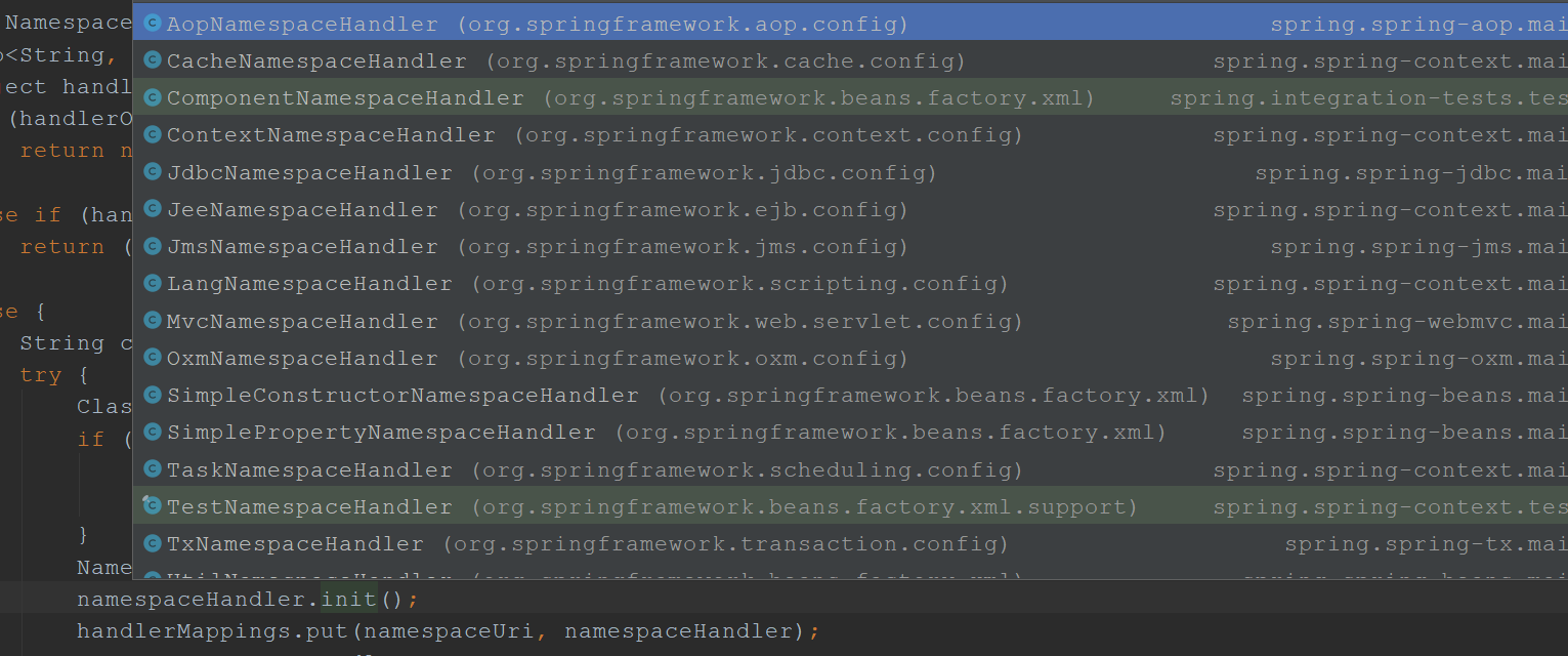 namespaceHandler.init();//执行他的init方法,下面截个图看看有都有哪些