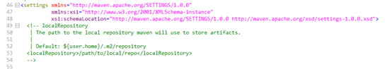 在第49行处找到localRepository,可以看到默认的存储地址为${user.home}/.m2/repository