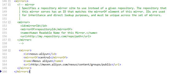 将阿里云镜像地址放在mirror下面,在第160行加入下面的xml语句