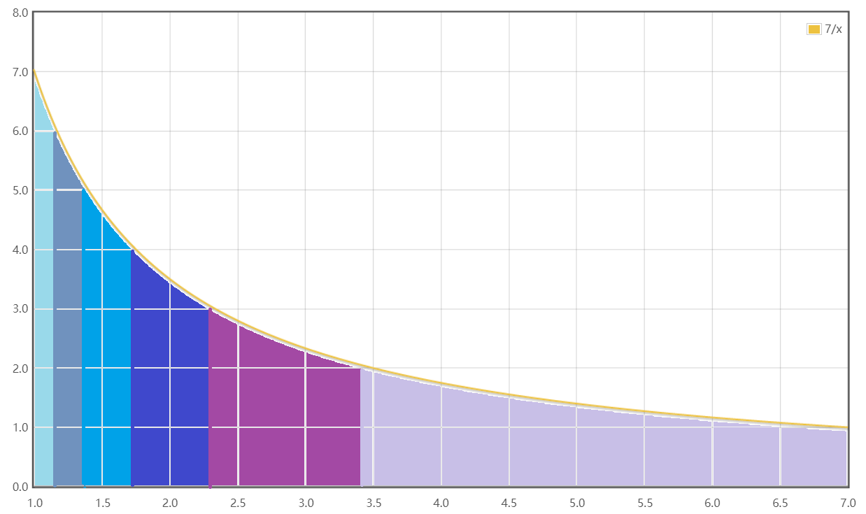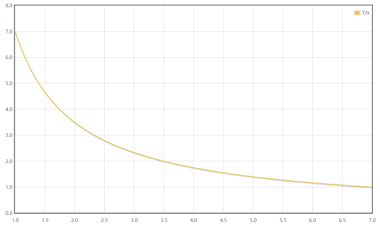 为了方便我们的研究,我使用绘图软件画出了 $f(x) =\frac{7}{x}(1\leq x\leq 7)$ 的图像,也就是一种反比例函数的图像。
