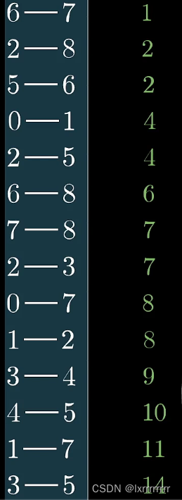 kruskal算法思想是先把所有的边按权值大小排序,得到这个样子